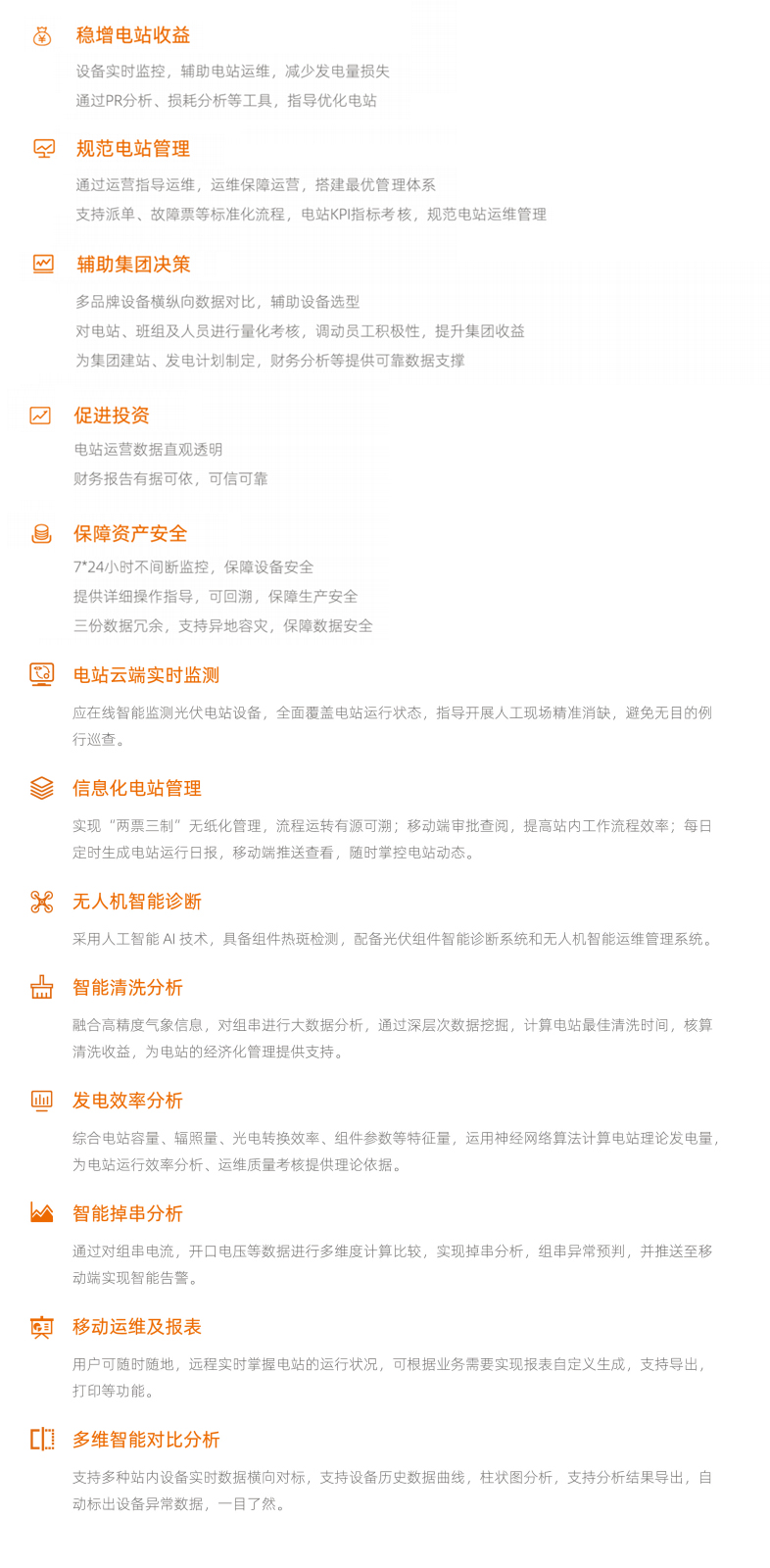 集中式智慧场站解决方案是基于四位一体箱变测控装置和组串式子阵通讯柜实现光伏区数据采集,通过通讯管理机实现站控层数据采集传输。以智慧场站综合管理平台为核心串联无人机巡检系统、光功率预测系统、智能功率控制系统、智能清洗系统,实现从数据采集、数据清洗、数据归类、数据分析、数据预测、数据应用的全闭环流程管理。通过一体化解决方案实现各个子系统间整合数据并协同合作,综合多维数据分析与交叉验证,提高故障检测准确率,提高运维效率。